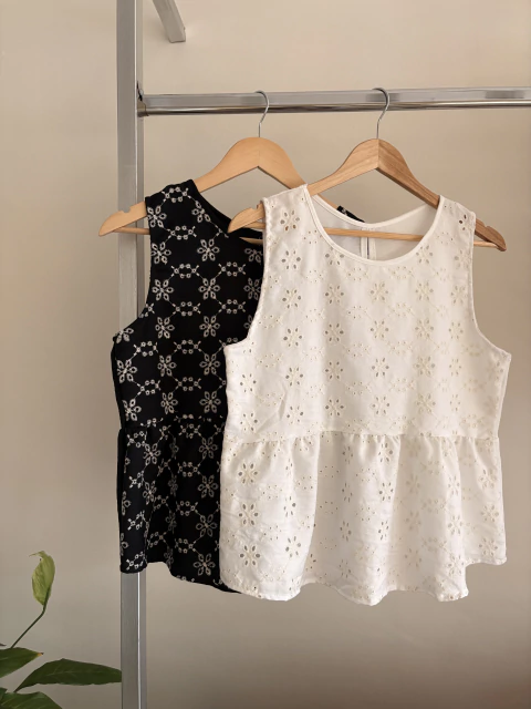 Forrada en broderie con diseño en toda la parte frontal, aporta textura, elegancia y un aire delicado que eleva cualquier look. No es una básica, es una musculosa con identidad.